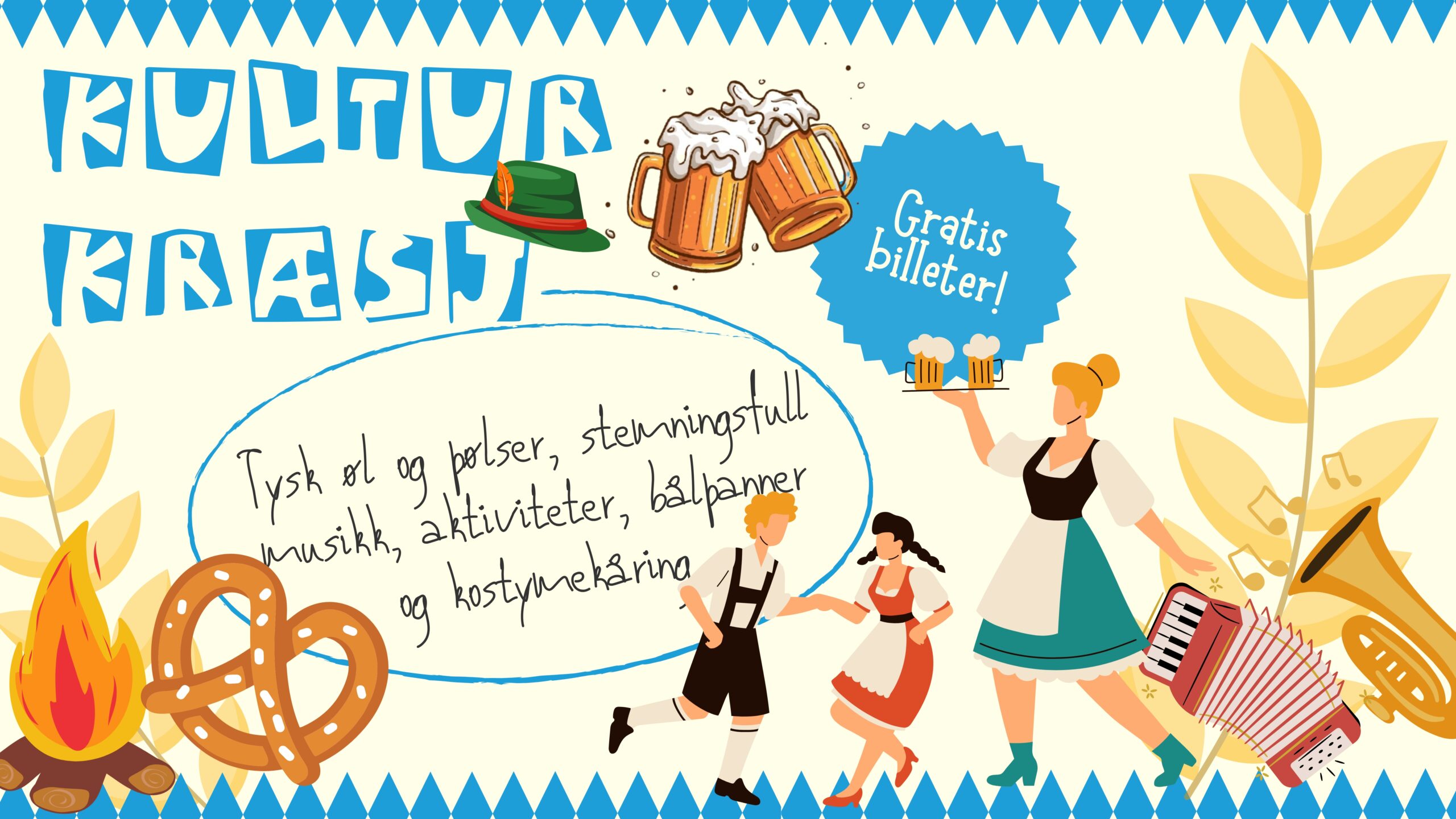 Tid for ny kulturkræsj på Agora! I oktober skal vi naturlig nok til Tyskland. Kjøkkenet disker opp med saftige pølser og digg tilbehør, i baren får du selvfølgelig tysk øl for anledningen! Arrangementet er gratis, men krever påmelding som du sikrer deg ved å booke billetter i vårt system.